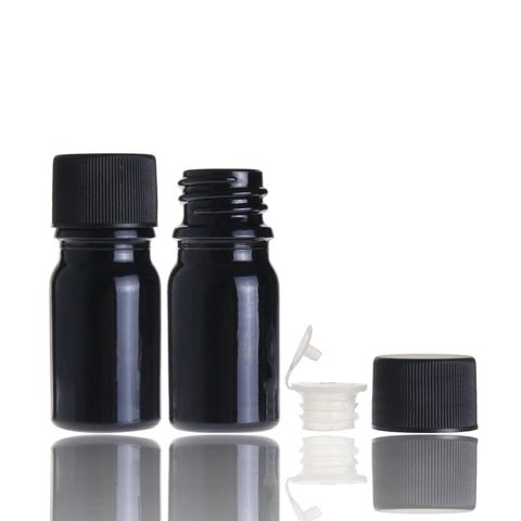 ขวดแก้วสีดำมันวาวน้ำมันหอมระเหย5มล. พร้อมตัวลดรูและฝาเกลียวสีดำ